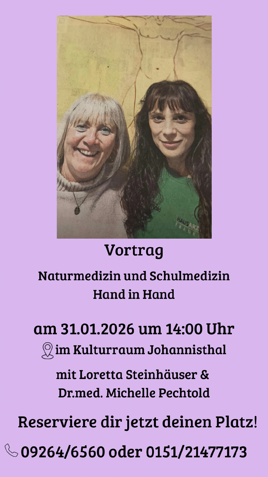 31.01.2026: Nach einem erfolgreichen Vortrag in Nordhalben geht es am 31.01.2026 um 14:00 Uhr im Kulturraum (neben der Feuerwehr) in Johannisthal weiter! Schulmedizin und Naturmedizin Hand in Hand neu hier im Landkreis Kronach. Wir glauben, dass es in Zukunft nur miteinander geht! Etwas ganz besonderes entsteht hier in unserem Landkreis. Mit Loretta Steinhäuser & Dr.med. Michelle Pechtold Anmeldung und Platzreservierung unter 09264/6560 oder 0151/21477173