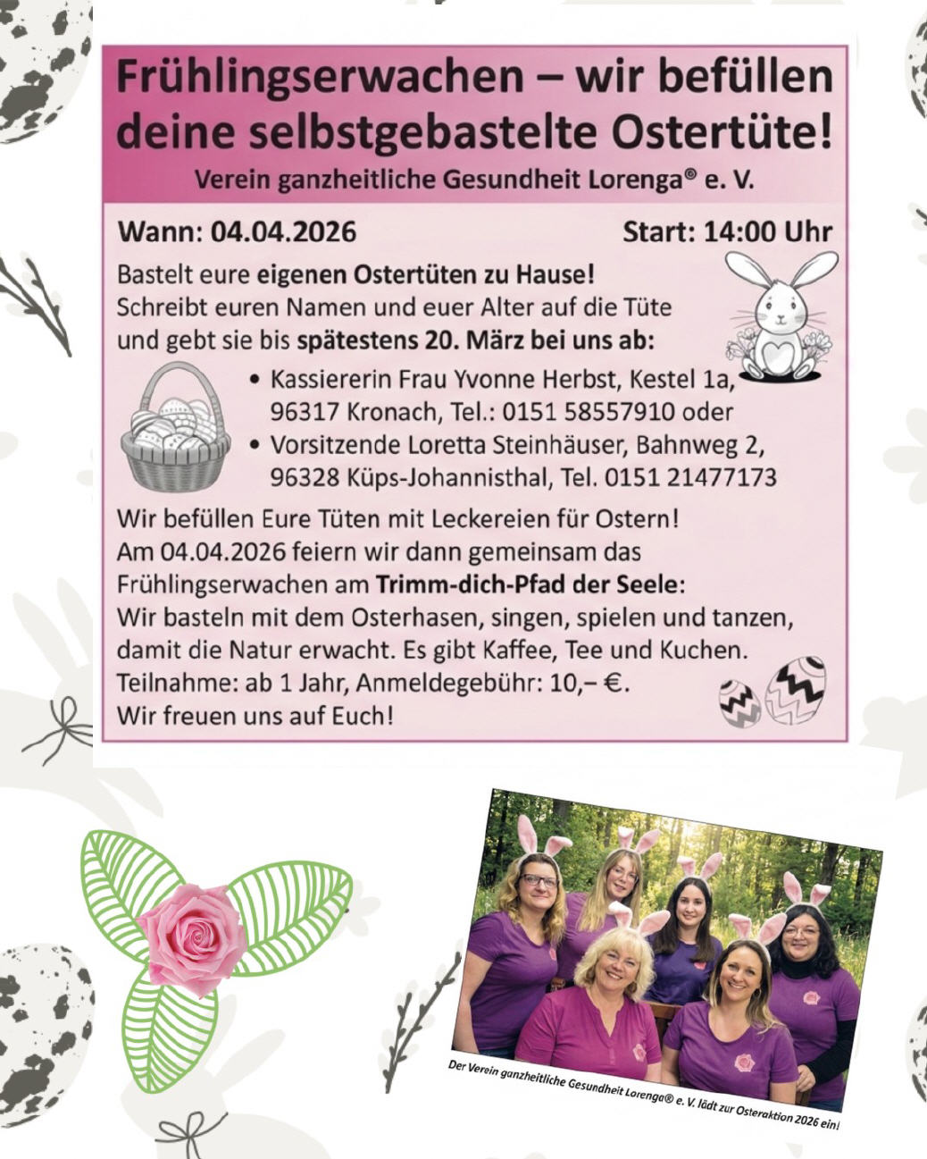04.04.2026: Osteraktion für die Kinder, Jedes Kind bringt seine selbstgebastelte Ostertüte. Teilnahmegebühr in diesem Jahr: 10,00€